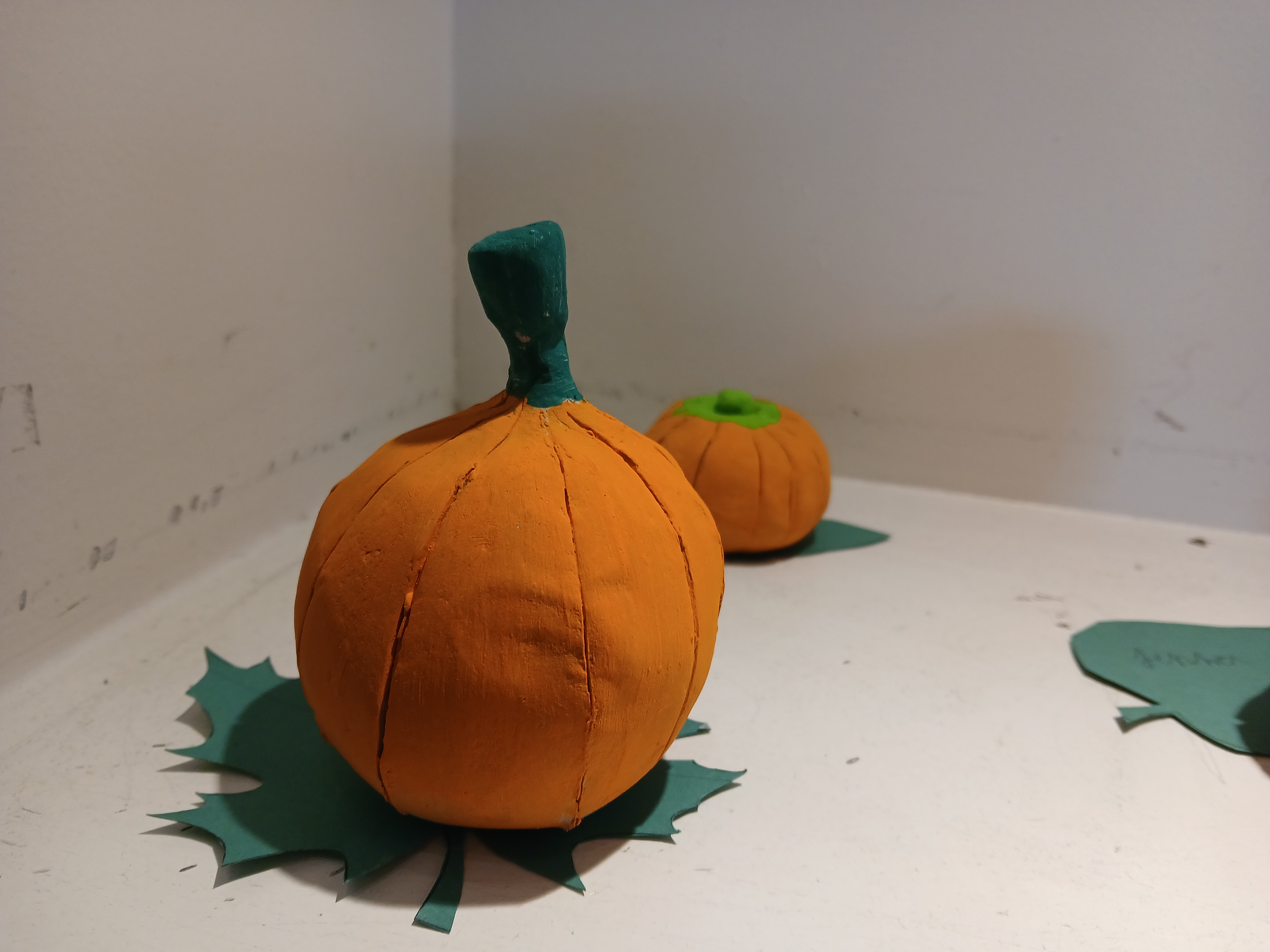 Als u de trap opkomt bij de hoofdingang ziet u onze pompoen kleiwerkjes in de koofjes staan. Eerst hebben we met behulp van een instructievideo een pompoen geboetseerd, die hebben we vervolgens beschilderd.